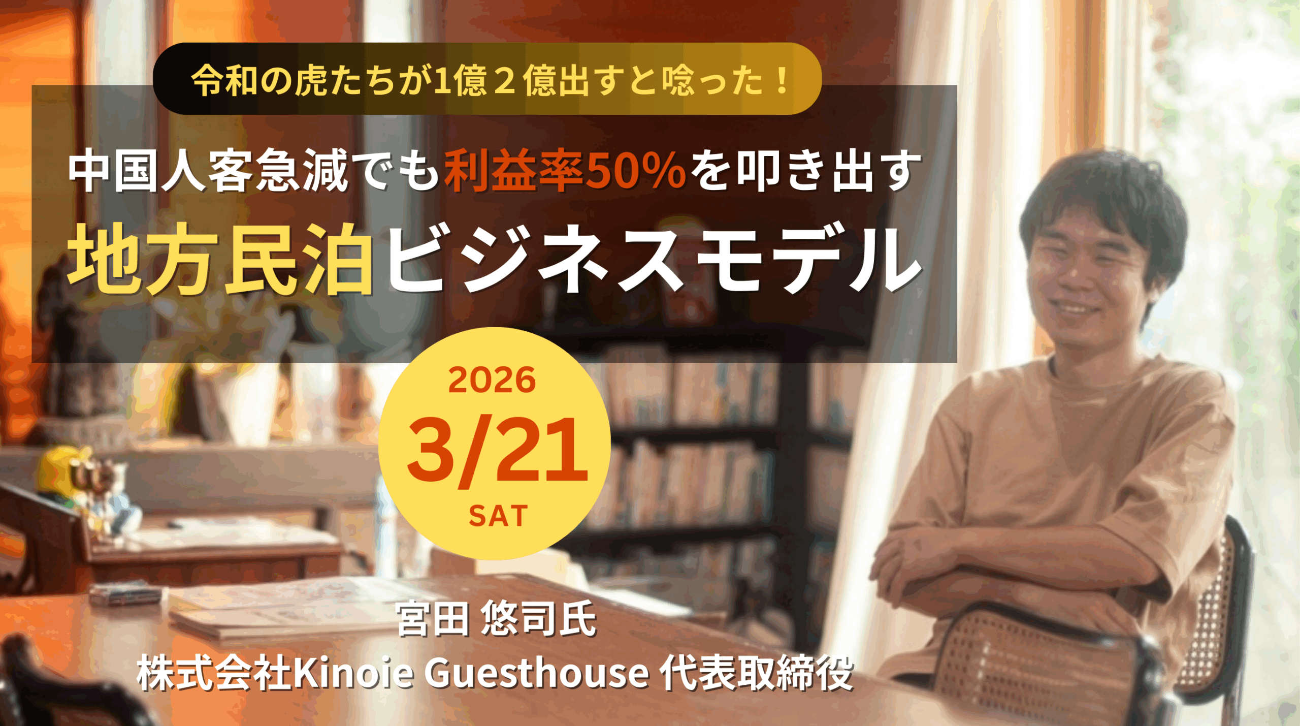 今回のセミナーでは、株式会社Kinoie Guesthouseの宮田 悠司氏を講師としてお招きし、そのビジネスモデルを包み隠さずお話ししてもらいます。